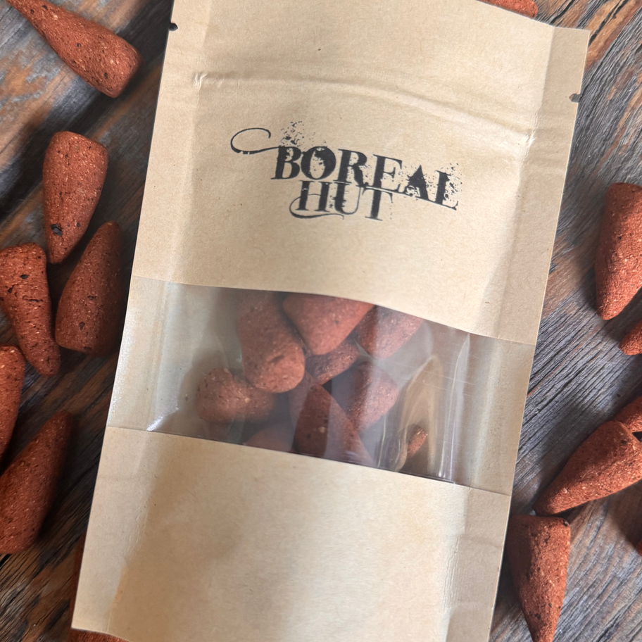A scent profile that is extremely agreeable, it begins gently with chaga, a traditional North American cleansing incense opening the experience, making way for the warm, expansion of cinnamon and clove's protective force. Cedar dances throughout the smoke, both elevating the scent and grounding it into tranquility. Sandalwood holds the base and smooths the entire experiences into a pronounced and yet subtle experience.